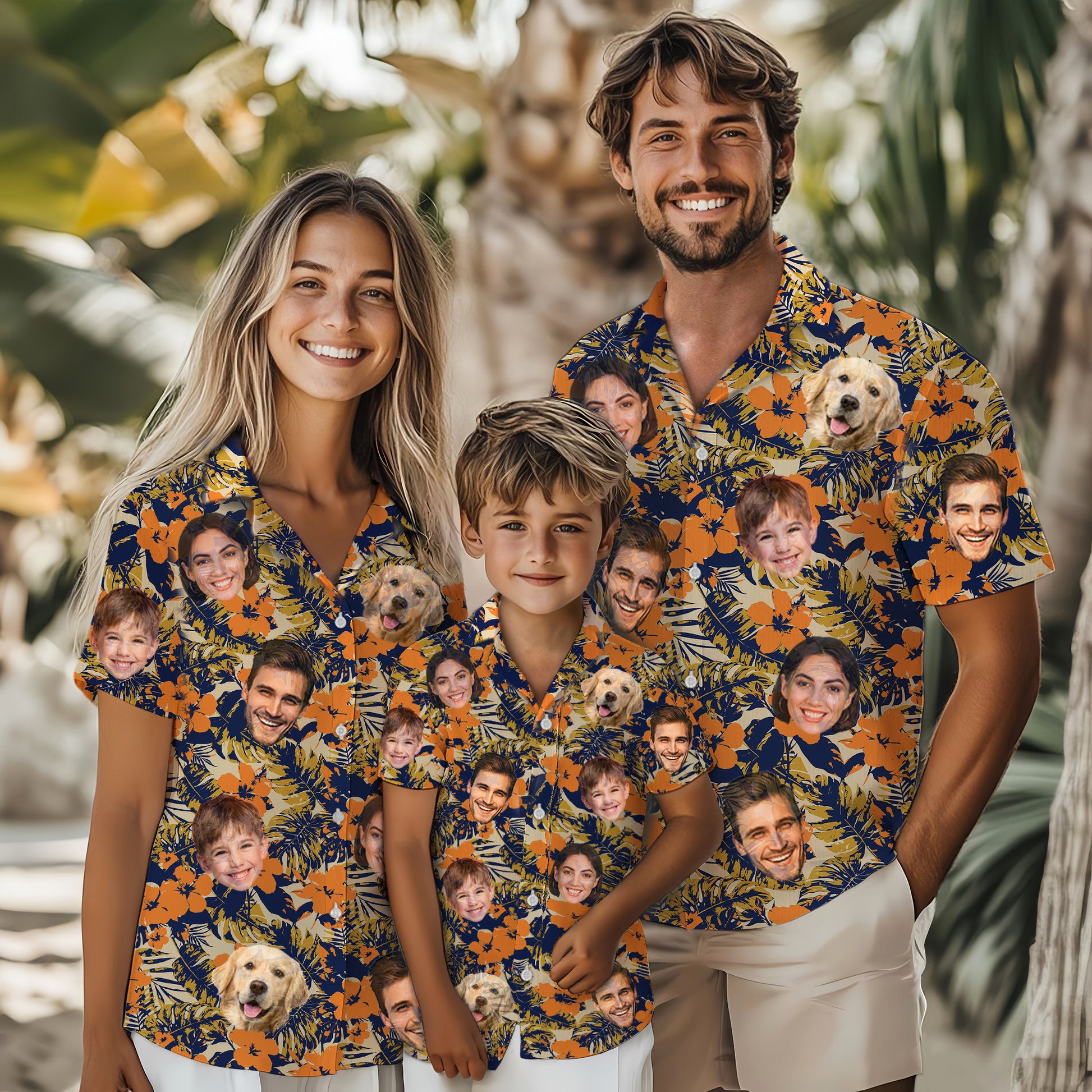 Custom Face Hawaiian Shirt, Personalized Orange Tropical Flower Shirt for Men, Funny Summer Vacation Gift, For Dads & Kids, For Father’s Day